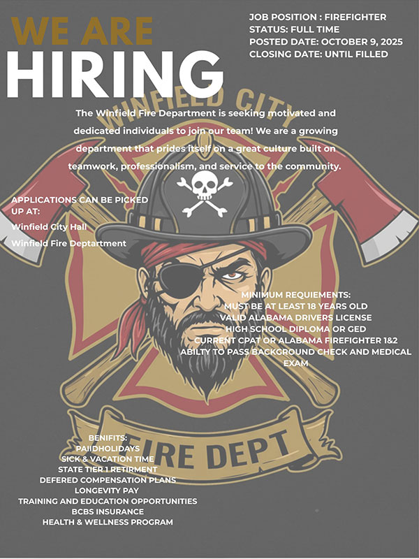 I appreciate the opportunity to serve as your Fire Chief and will do my best to make our citizens proud of the Winfield Fire Department.
